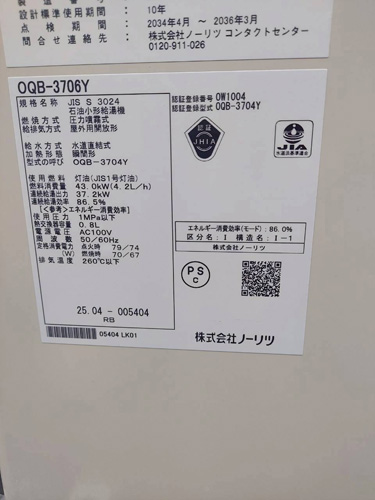 野洲市安治 ノーリツ石油小形給湯機OQB-3706Y 給湯器交換工事|滋賀県で給湯器・ボイラーの交換をご検討なら【滋賀給湯器.com】へ!